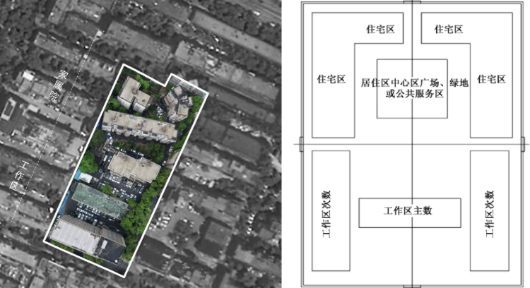 The work-unit Dayuan consists of a work zone and a residential zone for staff families. The work zone varies by function: industrial work-unit Dayuan mainly includes a production area and an office area; non-industrial Dayuan is composed of a main office building and auxiliary office buildings. The residential zone mainly includes four parts: housing (dormitories), public green spaces, public service facilities (kindergarten, canteen, clinic, boiler room, basic commercial services, etc.), and roads and plazas.