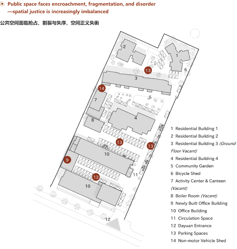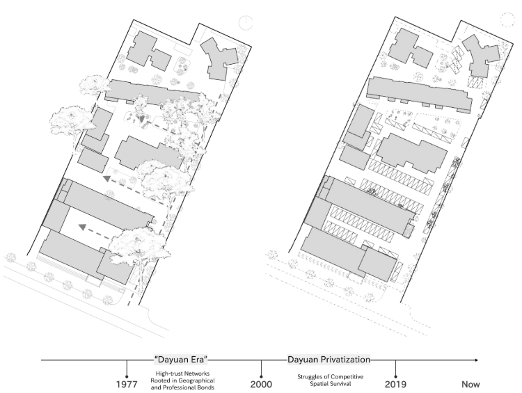 Looking back at the spatial evolution of the Dayuan, as residents' needs have grown and shifted, public spaces have increasingly faced encroachment and disorder. Some office areas, residential units, and communal zones have fallen into disuse, while others are subject to competitive occupation. This fragmentation under disrupted spatial order has led the community into a condition of “survival through spatial contention”.