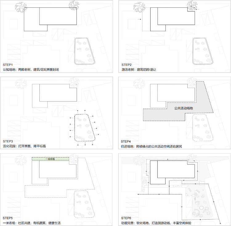 回看大院的发展演进历程中,随着人们的需求更新增长,公共空间面临抢占失序,部分办公场所、住宅单元及公共区域则呈闲置状态,这种秩序错乱下的空间割裂使社区面临抢占式生存困境。
