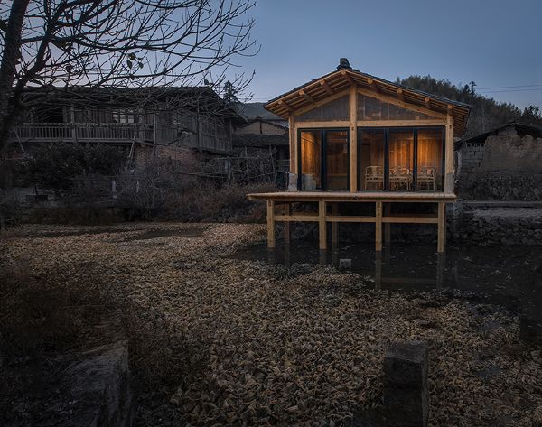 旧的杂物间被改造成池塘里的“荷花室”,也就是坐落在池塘上的茶室。游客可以穿过亭子到达平台上去欣赏池塘上方的美丽景观。