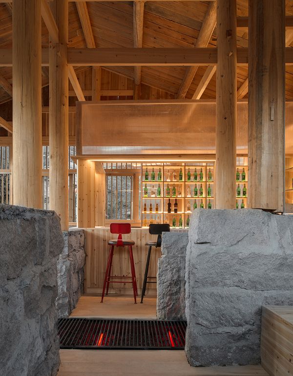 猪圈最初被分为四个空间,现在每个都包含一个新的酒吧,一个客厅,和一个炕。建筑师的目的是创造一个舒适和戏剧性的气氛,在这个空间里里面添加“家常”的内部元素。