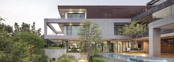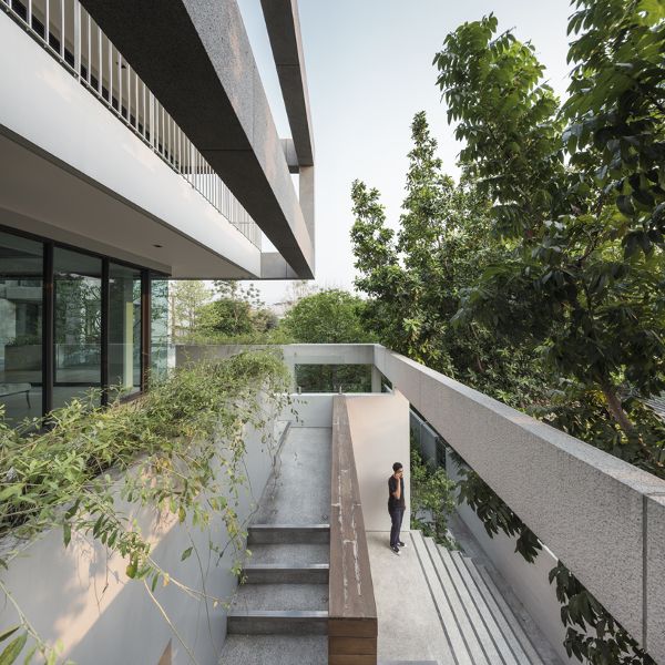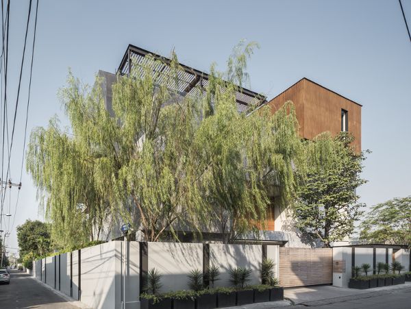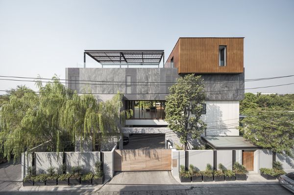 周围环境的背景是在jaransanitwong 75路的拐角处,在他的父母家旁边,他在那里长大。EKAR建筑师以泰国住宅的传统为基础,在640平方米的面积中,将传统建筑的概念融入到规划中,最大化的开发现有的空间。通过创建一个L型的建筑并抬高居住空间将首层架空,一楼可以放置东西和停车,空间很大可以停放10辆车。并且拆除了新住宅和业主父母家的住宅之间的墙,取而代之的是在原有花园的基础上补植了更多的植物,加强了两所住宅间的联系。