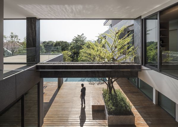 关于客户的想法,建筑师将这栋住宅分为了四层。二楼是为客人的家人准备的,而三楼是为他女儿的未来家庭准备的。因此,为了让每个家庭成员包括他女儿的未来家庭能够聚集在一起,第一层是一个焦点。在这一层,有一个娱乐室和一个大露台,作为客户家庭的公共区域。此外,受到传统泰式建筑风格的影响,这层楼被自然元素包裹着。在泳池和抬高的植物池之间种了一棵树,使得树可以从建筑的缝隙中长出来,在泳池旁营造出了一种河岸的效果。