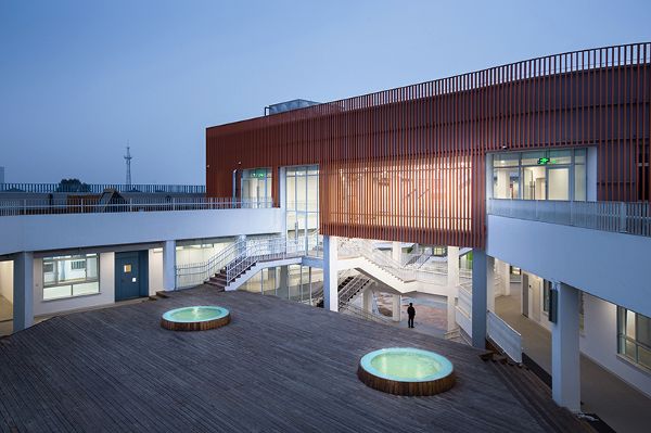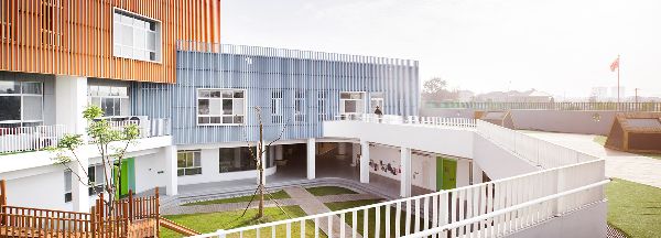由于中国幼儿园采用三年级制,上海的建筑实践在江苏省扬中市北部郊区设计了一套与年级相对应的三叶草式的六边形。每一个单元里面都有一个庭院,覆盖有不同颜色的百叶窗。