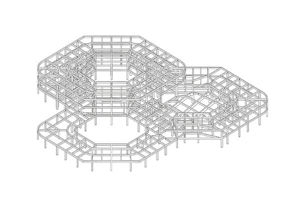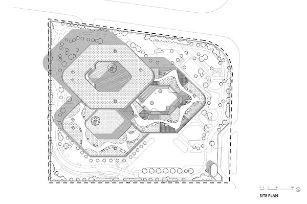 所有的项目都是围绕着三个有相同计划形状但不同楼层数的庭院,形成重叠和层叠的聚集形式。六边形的五个面各容纳一间教室,而第六边则是共享的流通空间或公共空间。教室位于六边形的上部,自然光线以最大化的进入和更好的通风。其他活动——音乐和艺术工作室、图书馆、多用途大厅、厨房和教师办公室——都位于低层。