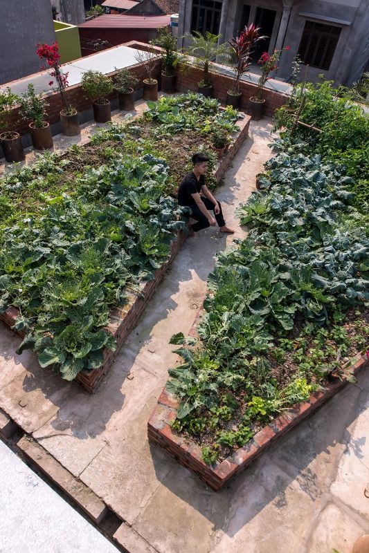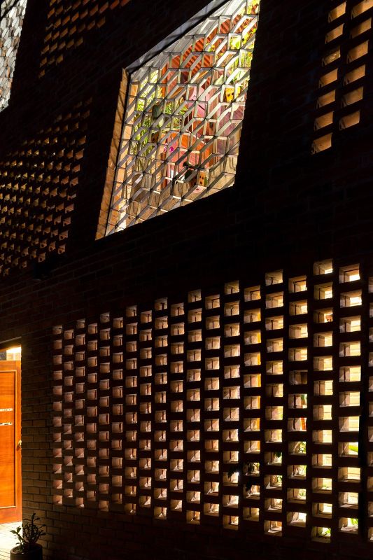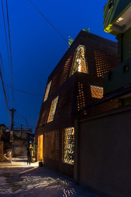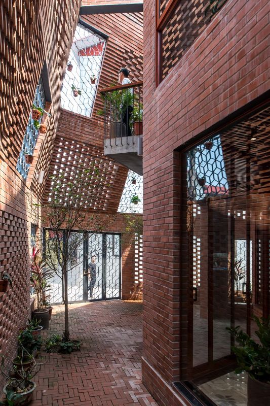 整体结构由两层砖墙组成,并由两层砖墙包围。该建筑位于一个十字路口,局部空间以绿色植物和蔬菜替代。砖块早已是当地熟悉的材料,并且由于其简单的手工施工而广泛用于越南的农村地区。这座建筑缺乏西方的对称理念,有些东西吸引了原始感官。它创造出一种既令人兴奋又令人安慰的空间景观。该墙建成一个角度,为该地区的景观创造更好的视角,并帮助'房子内各角落的用户通过阴影和空气感知时间和天气' H+P建筑师解释到。