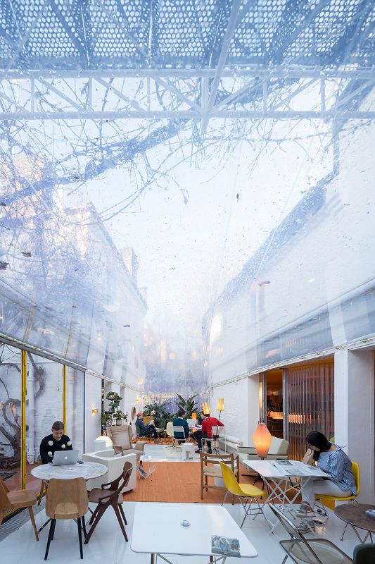 荷兰公园的Second Home还有一家与Faber-Fabor合作创办的小型诗歌书店,Faber-Fabor是出版商的第一家实体书店。该空间种植了35棵树,有些甚至直接从地板上生长出来。Selgascano还使用了新型屋面来引入额外的自然光,同时,温室技术首次应用于办公场所,庭院内的肥皂泡作为环保和节能的隔热材料。