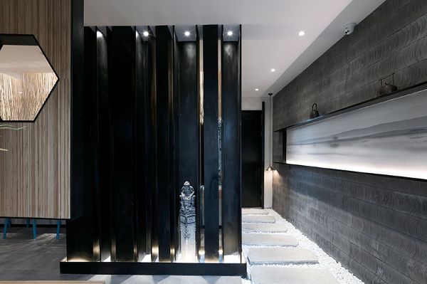 黑色钢板是空间的主要主题。这些钢板将原先的建筑承重柱奇妙隐藏,又可作为功能分区隔断,引人期待一场时空错置的秘境之旅。接待厅顶部由无数根竹签组成独特的装置艺术,接待台是一根长七米的整板一直连贯到茶室VIP区,以延展的张力和美感颠覆传统的前台模式。