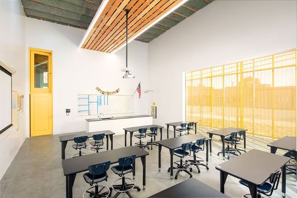 这所学校位于洛杉矶南部的贫困区,该区域人口的25%生活在贫困线以下,犯罪并不稀罕,因此学校使用20英尺高的穿孔防弹金属墙面。这一特色融入建筑的设计中,并没有分散建筑本身的形式。场地的院子使建筑得以呼吸,同时为学习和社交活动提供一个安全踏实的环境。