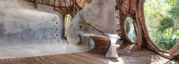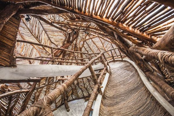 这座画廊坐落在生态环境友好的Azulik度假村,是度假村创始人以及自学成才的建筑师Jorge Eduardo Neira Sterke脑力劳动的结晶。尽管设计中大量使用了木材,但在空间结构部分则没有使用一棵树,空间由一系列扭曲、波状起伏的地面以及门廊组成。大面积圆窗将自然光引入室内,光线渗透到整个墙壁围合成的空间中,墙壁则利用透明玻璃纤维进行加固。
