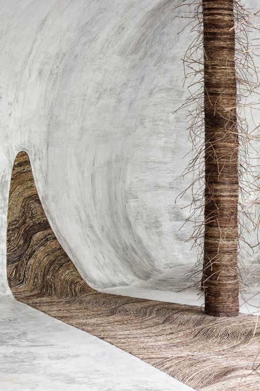 画廊内部空间与大多数艺术空间毫无装饰的美学特征大相径庭,邀请参观者赤脚走入其中,将地面视作生物体并与之互动。从抛光水泥到未经处理的贝乔科(当地原产的一种藤蔓植物)木质地板,从热到冷不断变化的温度让人们将焦点聚集在周边自然之中。