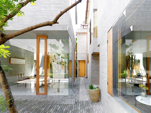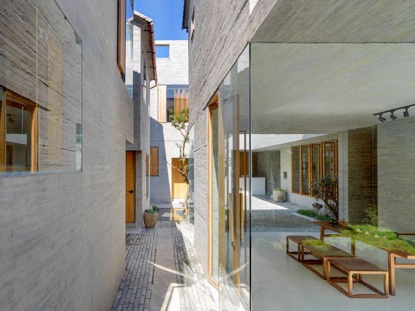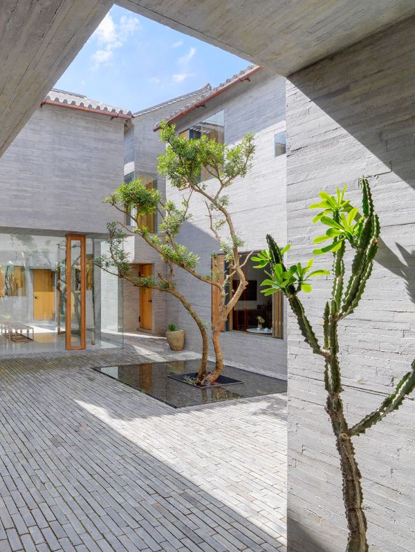 庭院通常有一个缺点,就是在一天中的某些时候太黑;然而,既下山酒店没有这个问题。赵扬建筑事务所设计了一套方案,保证光线和视觉的通透,使庭院成为一个开放的空间,光线投射到各个角落,阴影和阳光混合在一起,起到阴阳调和的效果。玻璃是如此巧妙地安装,以至于人们都会怀疑它们的存在/知道空间的起点和终点。