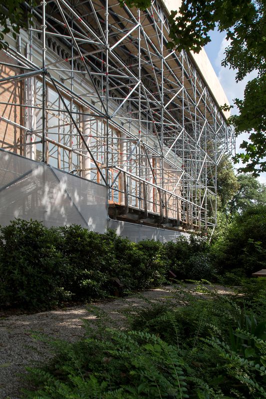 在2018年威尼斯建筑双年展上,英国馆被脚手架覆盖着,支撑着屋顶水平的露天广场。策展团队与艺术家马库斯·泰勒(marcus taylor)共同设计了一个名为caruso st john architects的展览,以两种完全不同的环境作为对此次展览主题的回应。与屋顶上新的公共聚集空间形成鲜明对比的是,展馆内部被有意抛弃——在2017年的最后一场展览之后,没有受到影响。