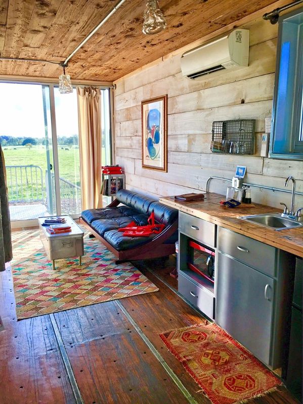 从集装箱本身到内部装饰,每一个都是升级的巧妙示范。每个集装箱的内部都覆盖着可持续的木材,均是从纽约北部的公司的农场中收获,窗户被从费城的一所学校抢救出来,这所学校被安排拆除,厨房的橱柜在布鲁克林的一个实验室里曾经是橱柜。其结果是一个复古风格的生态住宅,带有一点西方的风格。