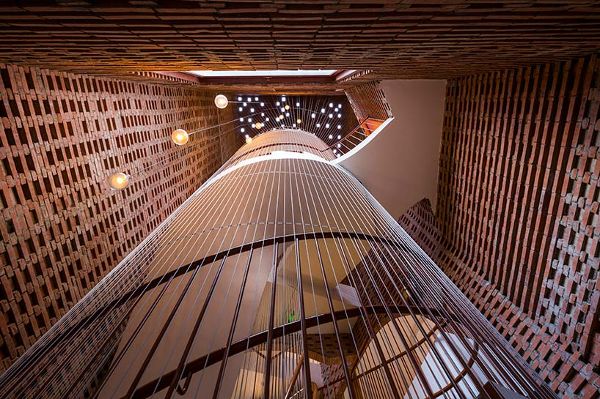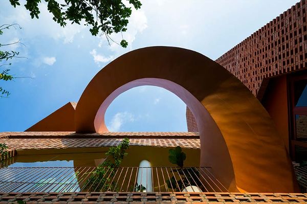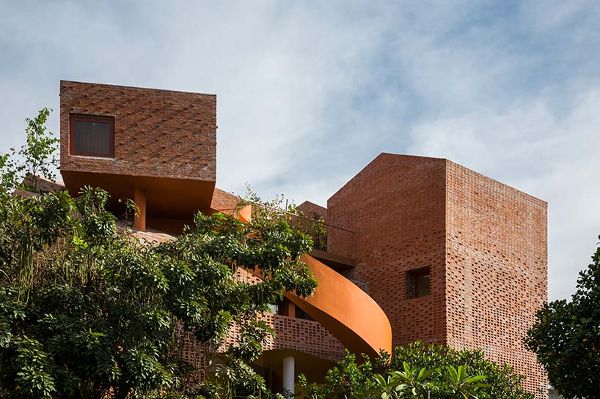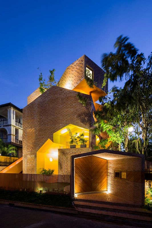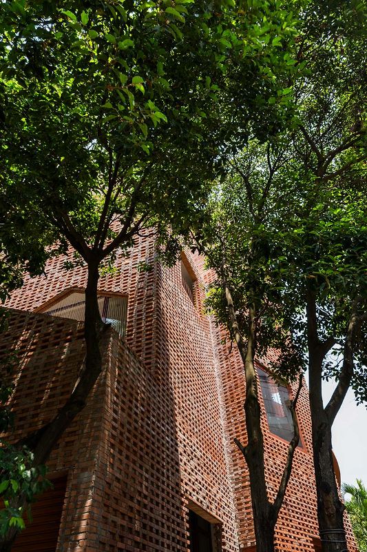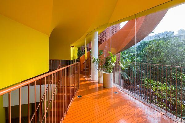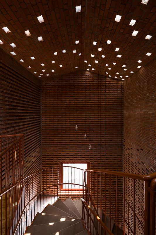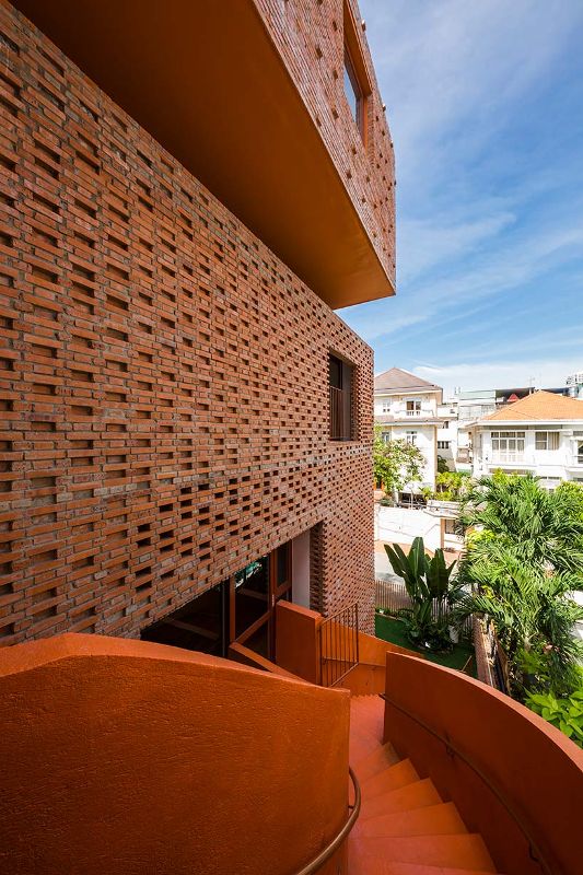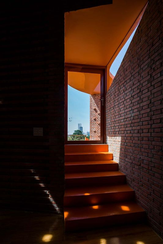 从这些巨大的砖塔中,出现了一个外部楼梯井,它们以一种新的叙事方式交织在一起,在阳光明媚的日子里创造出了逃离阳光的瞬间。楼梯间的空间就像房屋的轮廓一样被解剖,创造出有趣的充满光明和阴影的空间。在内部,在这个空间中航行也同样令人愉快——一个开放式的螺旋楼梯被通向下方的专家石砌建筑挡在了门外。根据kientruc o的说法,每一层都以交替模式排列,以加强垂直互动,鼓励孩子们更容易接受周围的环境,并激发他们内心的创造力。