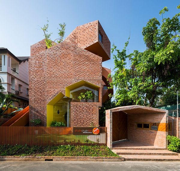 kientruc o设计的“chuon chuon chuon kim 2幼儿园”几乎完全是用暴露的砖块建成的。建筑师们注意到这个项目与乐高建筑的相似之处,可能是由于它的色彩过于鲜亮明快。砖块砌成的墙各不相同,每个部分都有独特的组合,吸引眼球,激发想象力。砖块的颜色是用橙色和黄色来表现的。