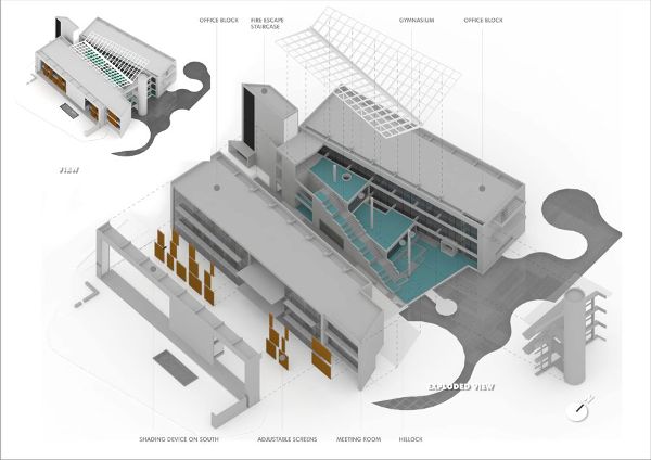 建筑在功能上分为两个部分——它们都大致是东西向的,长立面朝北和朝南。东侧和西侧留有非常小的开口或没有开口,以遮挡早晨和晚上水平的太阳。办公室工作所需的所有光线都来自南北两面,它们完全开放,在夏季只能产生漫射光。