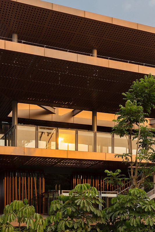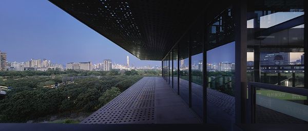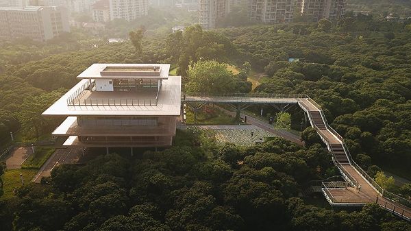 MLA+事务所设计的香蜜科学图书馆是一幢轻盈的建筑,与穿过公园的“树顶步道”相连。钢结构和全玻璃幕墙构成了建筑明亮通透的基础。巨大的悬臂式结构覆盖以金属涂层,作为遮阳板,其形态参考了当地的传统建筑。