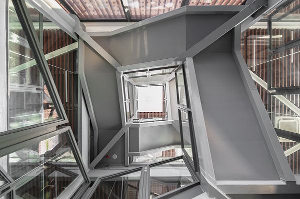 该建筑包含会议室、阅览室、书籍杂志区、露台以及行政办公室。公共空间从地面抬升,创造出一个全景露台,强调出对于自然环境的体验。图书馆本身也是一个公共楼梯,将地面层和桥梁层连接在一起。栖息在树林之间,建筑为每一层空间带来不断变化的景观体验。界线虚化的首层空间成为周围影影绰绰树林的一部分。上方的楼层位于树叶密集的树冠之间,因此有一种更亲密的感觉。顶层为人们提供了周围环境和城市的景观。
