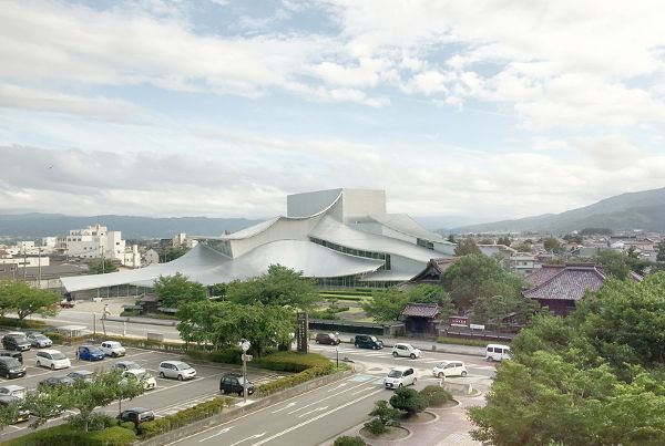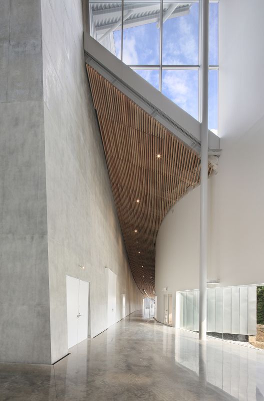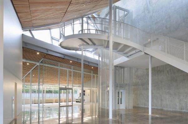 从外表上看,这座建筑被分成了几个体量,越靠近场地周边,体量越小。这样设计不仅减少了综合体的规模,也有利于与周边环境保持联系。在场地开发设计的过程中,妹岛和世采用了“Sayadou”的风格,从历史观点上来说,这种风格包括在圣地或寺庙中建造一种保护性构筑物,用以躲避恶劣天气的影响。场地的布局如同一座“葡萄园”,建筑的焦点放在了音乐厅上,观众席一层一层地包围着舞台。