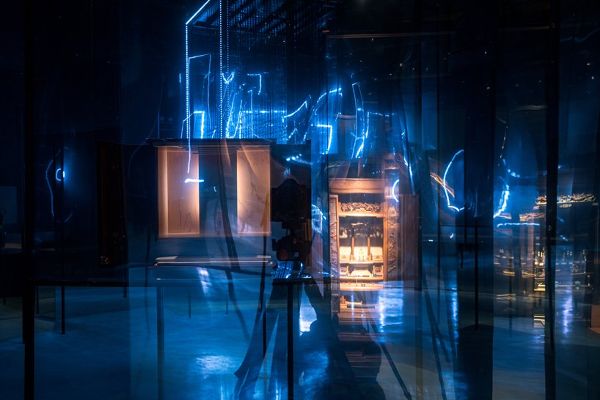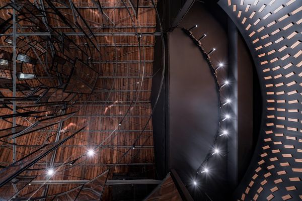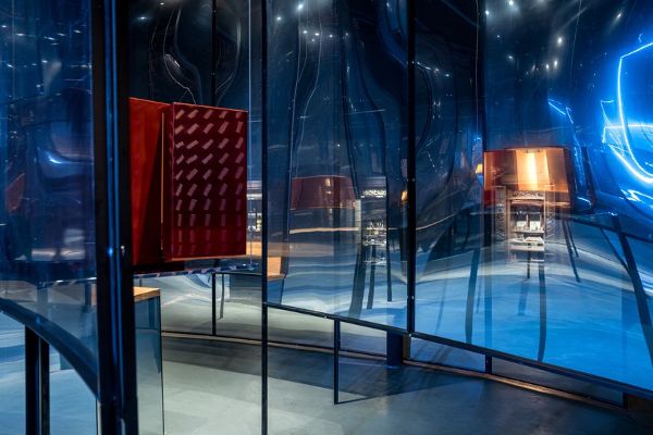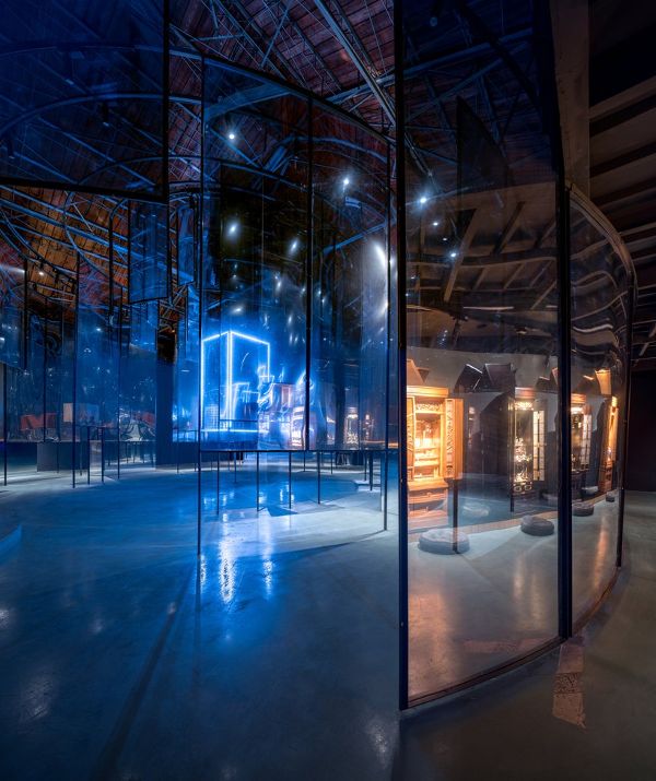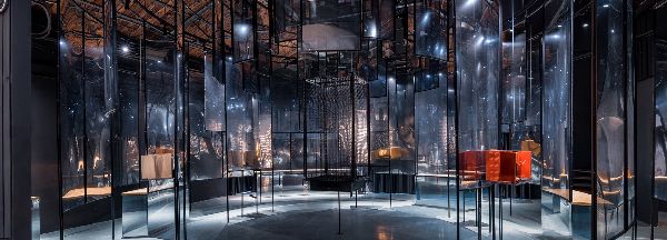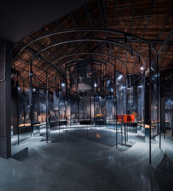 由栋栖设计建筑事务所设计的车间位于一个以前的工业建筑内,其设计理念围绕着一个圆圈。许多同心圆在玻璃和镜面材料中形成,创造了迷宫的概念,表面优雅地展示了佛教圣地和纪念品。随着曲线从中心点展开,空间提供了一种有趣的元素,邀请游客在迷宫中漫步,探索展品。在这些环的中间坐落着引人注目的“空间”装置——一个作为空间高潮的虚拟神龛。