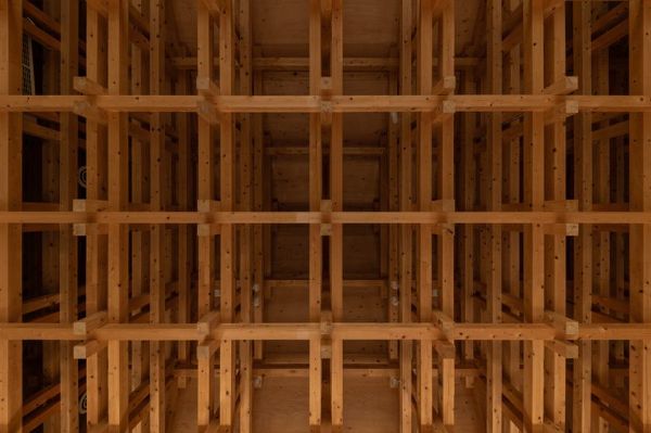 通过厚重的格子框架中层层叠叠的木材,森田和也设计事务所为图书馆创造了强烈的视觉识别。每一块9厘米的柏木方木片的长度只有3到4米,为了避免材料的横截面损失,建筑师选择使用长螺丝将它们固定在一起,而不是使用传统的搭接方法。与木格框架形成对比的是,建筑的混凝土基础为整个结构提供了支撑,同时作为蓄热体,稳定室内环境温度,并将能耗降至最低。