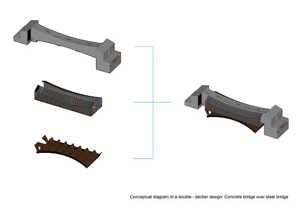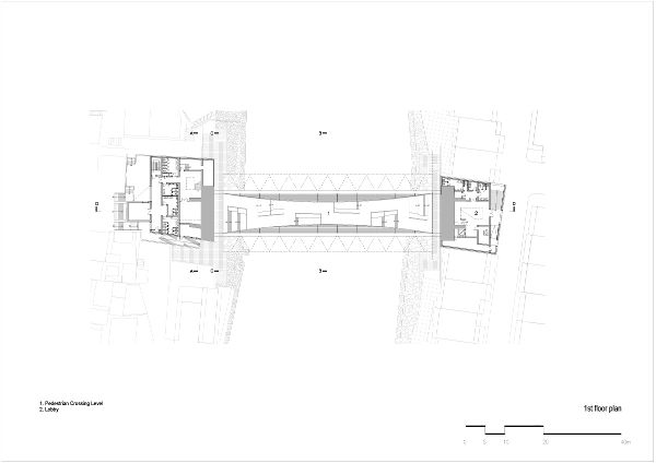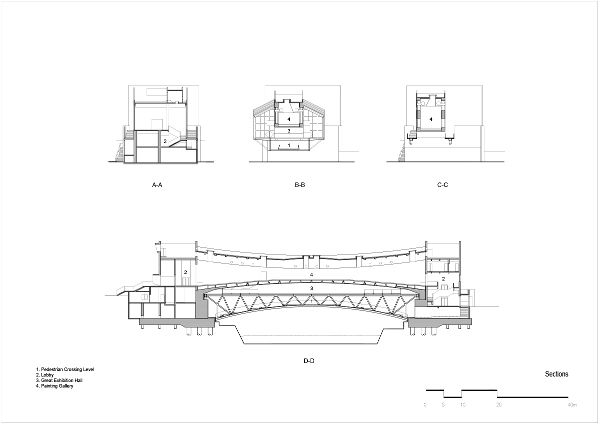 桥下一层采用开放式钢桁架结构,模仿有屋顶的街道,供行人通行,而上层走廊则采用现浇混凝土拱。博物馆覆盖了全高的玻璃,这使得明亮的室内能够反射下面的水,同时瓷砖遮阳系统覆盖了画廊的主厅,用于临时展览。在博物馆两端的两个桥头堡内,有入口大厅、行政办公室、商店和茶室等休息空间。行人和游客可以从河的两端进入博物馆。