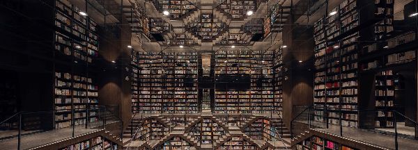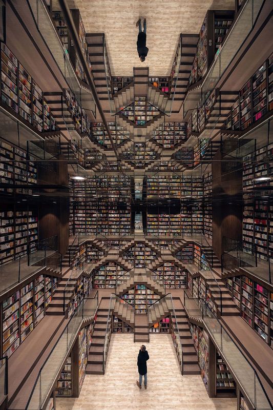 沿着走廊往下走是主要的书房:一个“阶梯厅”,在这里,埃舍尔式的楼梯兼作书架,镜面天花板使原本就很大的房间扩大了一倍。从大厅到四楼是休闲区,游客可以在这里喝杯咖啡或茶,通过阅读沉浸在一个宁静的不同故事的世界。重复出现的“灯罩形书架”在这个区域创造了分散的摊位,人们可以在这里共度时光,享受彼此的陪伴。