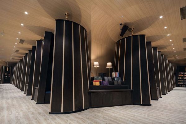 X+living重庆中树阁书店位于杨家坪卓迪广场三、四楼,以简洁的玻璃幕墙迎接顾客。在内部,深棕色的大厅包含了分散的灯罩形状的书架,从内部的阴影投射出光线,重现了在明亮和温暖的私人书房的感觉。一个安静的阅读走廊位于大厅的一角,沿着走廊延伸的书架反射地面,形成一个书籍隧道,吸引游客更深地“进入空间和知识”。在大厅的另一个角落是儿童阅览室,彩色的书架上画着重庆的风景、建筑和交通,让孩子们在阅读的同时沉浸在这座迷人的城市中。