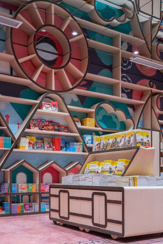 由上海的X+living公司的“重庆钟书阁书店”展示了重庆的风景和历史名胜。两层楼的商店邀请游客进入剧院内部,这是典型的工作室设计方式,充满了灯罩形状的书架,一个像埃舍尔(escher)一样的阅读区,以及一个彩色的儿童房间,绘有城市景观、建筑和交通的图画。