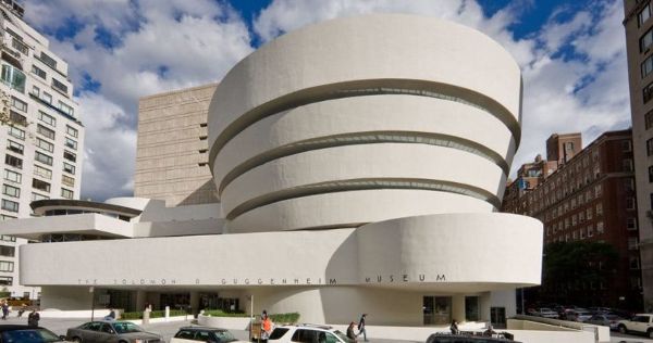 古根海姆博物馆,纽约(建于1956年至1959年)图片由古根海姆博物馆提供。流水别墅的图片由宾夕法尼亚州西部保护区机构提供。怀特还将有机形式融入他设计的古根海姆博物馆,游客先乘坐电梯到达建筑物顶部,然后沿着缓缓的螺旋式坡道往下走。