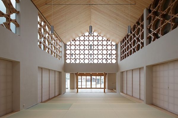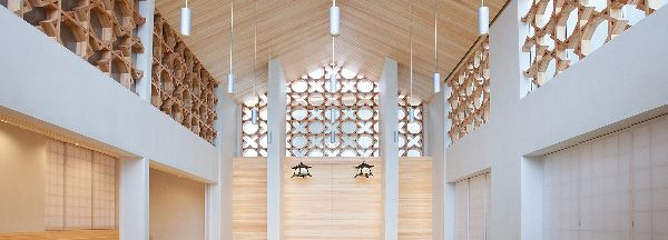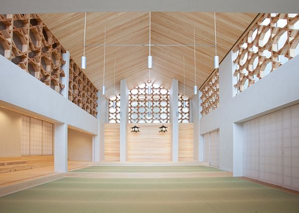建筑的中心是崇敬礼拜本身的空间,它由暴露的木材天花板和超过两倍高的体量连接。在这个房间里,建筑师使用了传统的日本建筑技术——木格子——它被塑造成konkokyo宗教的象征。除了创造一个装饰性和象征性的元素,图案提供了对太阳辐射的屏蔽,同时也作为一个“透明的抗震墙”,这已被性能验证测试所证实。