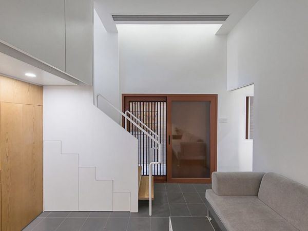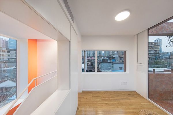 URBANUS通过重新组织每个22平方米的生活空间,创造出相互连接的房间,并确保它们都能通过一系列有策略性的窗户和顶层额外的天窗获得充足的自然光和通风。客厅和厨房被安置在一楼,大部分家具都是内置的,以节省空间,创造更多的可能性。为了加强整体结构,并简化垂直循环,工作室用一个舒适的双人楼梯取代了原来的单级陡峭楼梯。顶层新建的透明房间和露台提供了城市全景视角,以及灵活的活动空间。