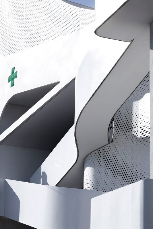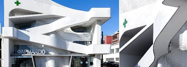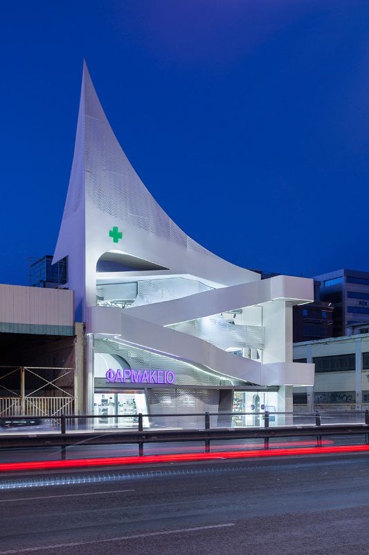 klab建筑事务所在药房顶部设计了一个巨大的三角形穿孔结构,如同希腊最大的港口piraeus一样,连接大陆和岛屿。该项目位于一个旧仓库兼夜总会的旧址上,对原有建筑进行了彻底的改造,用新的混凝土结构加固了原有的石墙,并建立了新的立面。
