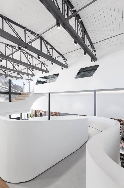 klab建筑事务所的摩尔药房是美国最大的药房之一,其外观和内部外观都体现了大海的概念语言。在内部,一系列的夹层以不同的方式相互连接,划分了前仓库的大而开放的体量,而弯曲的坡道创造了一条动态的流线,连接了商店的两层。一间会议室和办公室,以及一个用于聚会、瑜伽课、研讨会甚至戏剧表演的独特的多功能空间,位于上层,而一楼预留了零售区和一个小实验室。