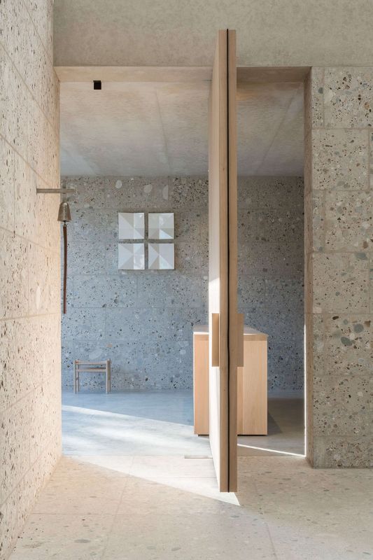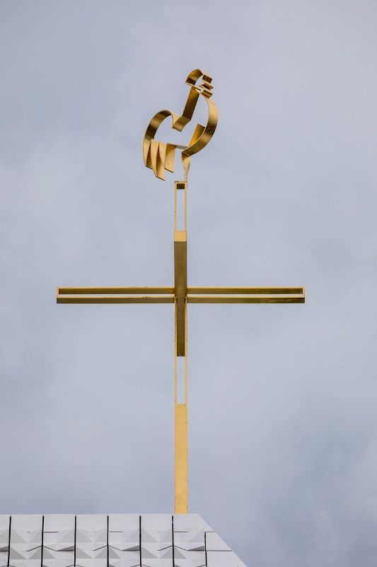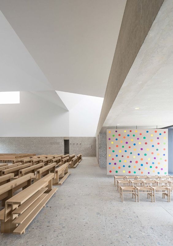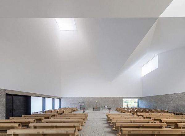 meck architekten的设计连接了新的北部和旧的南部地区,形成了一个向西北方向延伸的大型绿色走廊。教堂不规则的屋顶景观成为poing社区的水晶皇冠,屋顶上有一个镀金的十字架和一只向东看的公鸡。在室内,通过不同的天窗和三个大开口,空间充满了光,创造了一个类似于神圣的三位一体。墙面的特殊处理,加上漫射散乱的自然光,营造出一种超然的氛围。