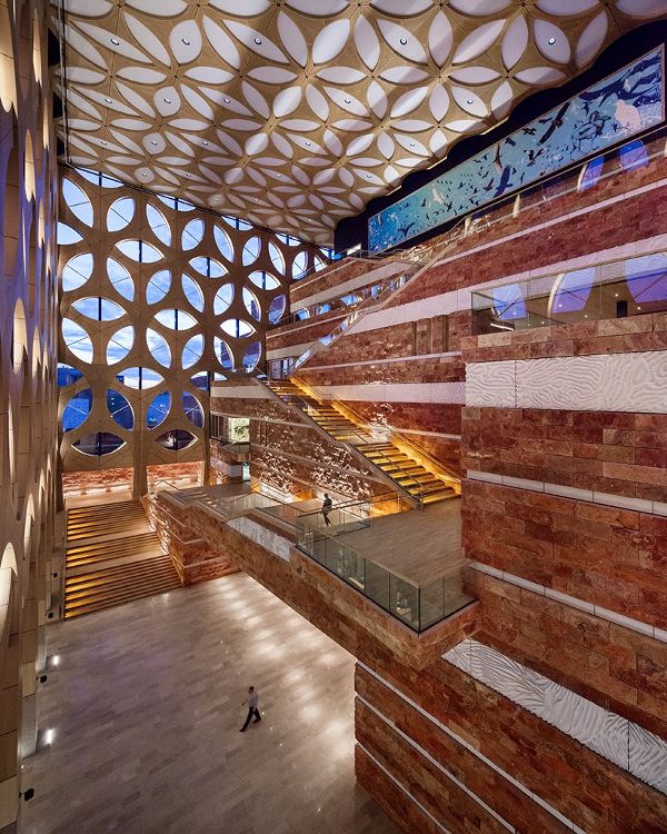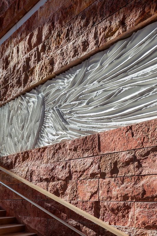 从外部看,展厅被包裹在水平层状石块中,仿佛天然的地质结构一般。镶嵌在石灰华石材中的天然水晶在建筑物的外立面上散发着耀眼的光彩。Neutelings Riedijk Architects邀请荷兰时装设计师Iris van Herpen根据该博物馆收藏的自然界中的形状创造了263块白色混凝土面板,并将它们嵌入墙体。这些面板看起来像丝绸一样光滑,如同流动的织物——这是对Iris van Herpen创新的服装设计的肯定。