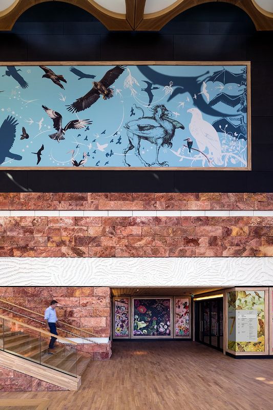 餐厅,商店和展览厅等公共功能都位于首层,游客还可以在那里查看关于最后一批被冲上岸的鲸鱼的调查。在博物馆内,荷兰设计师Tord Boontjeknown设计了100块引人注目的彩色墙板。这些墙板通过视觉故事的形式融合了摄影和绘画,通过精美的花卉和动物图案展现出了自然世界的奇迹。