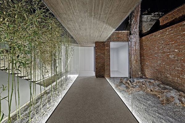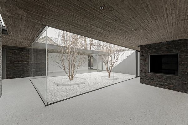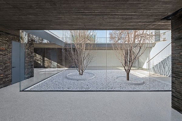 该项目采用传统四合院常用的建筑材料,如砖,青瓦和水泥。 屋顶均为青蛙铺装,这些青瓦沿不同方向线性排列。值得注意的是,这些青瓦延伸到室内区域,产生如流水一般的视觉效果。屋面采用现浇混凝土结构,室内表面保留了木纹模板的自然纹理。砖盒子则是用附近被拆毁房屋的旧砖砌筑的,墙壁一直伸展到屋顶,形成了休息座椅。