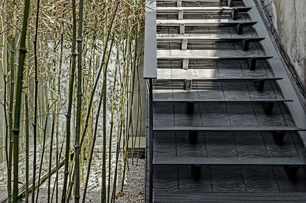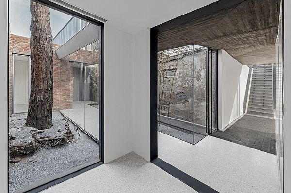 平屋顶不仅是房屋内部的一个新公共活动场地,也是内部功能的延伸,其景观与周边的坡屋顶建筑和树木形成了有趣的对应。沿着循环的路线,四个不同规模的院落排成一行——包括入口用竹子装饰的狭长院落;保留着原有老槐树的院落;一个清除了原来的玻璃顶,以水景和鹅卵石为特色的院落;以及一个连接邻居家后院的朝南院落。