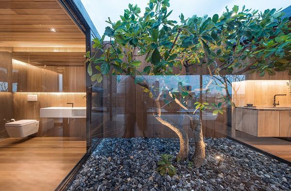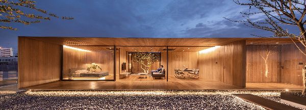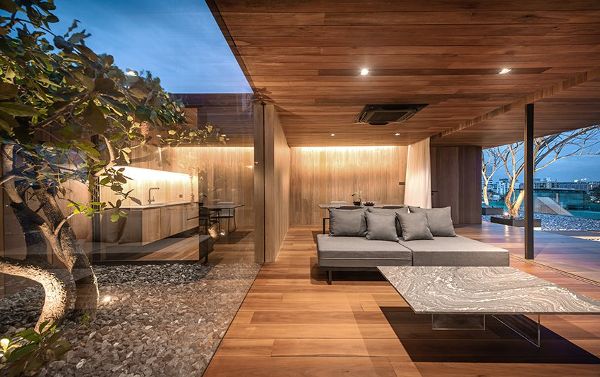 前段由三个网格组成,用作餐厅、客厅和卧室,业主可以通过一扇大的滑动玻璃门欣赏全景。其余三个网格则包括浴室、一个可以从房子任何地方看到的庭院和一个厨房。由于业主有大量的Balau木板,因此它们被用作包层材料,最终的效果是一个用木材的暖色调搭配天空的冷色调完成的空间。