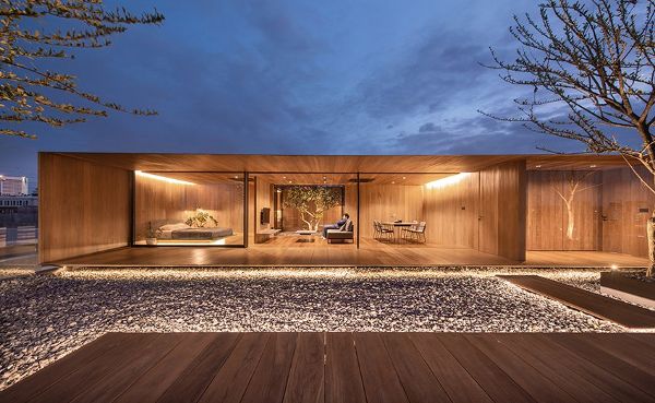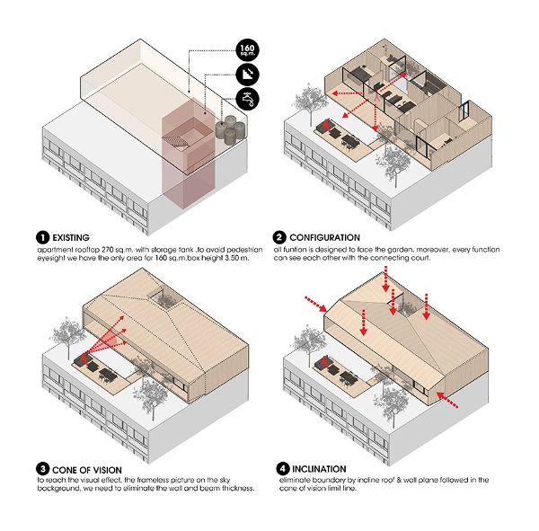 WARchitect在泰国曼谷设计了一座5层公寓楼之上的空中景观住宅,位置独特。屋顶以前只用于储存水箱,留下了一片空旷的空间。因此,房主决定建一座小房子供自己使用。鉴于其不寻常的背景,房子有一个混凝土庭院而不是正常的地面层,而树木则被周围建筑物的垂直线所取代。
