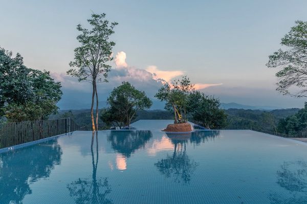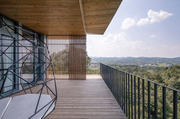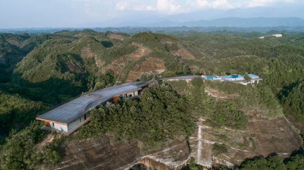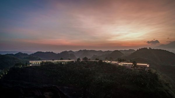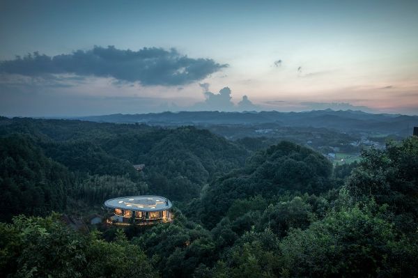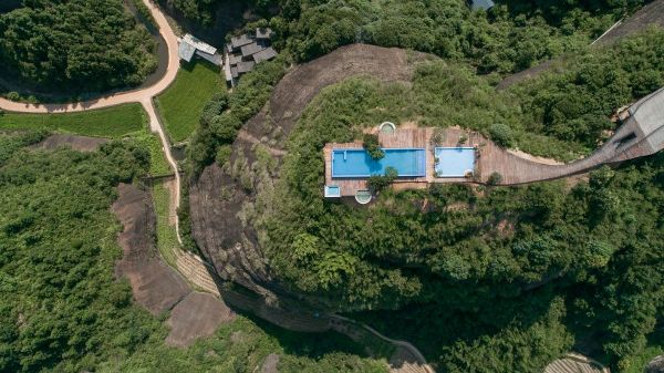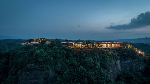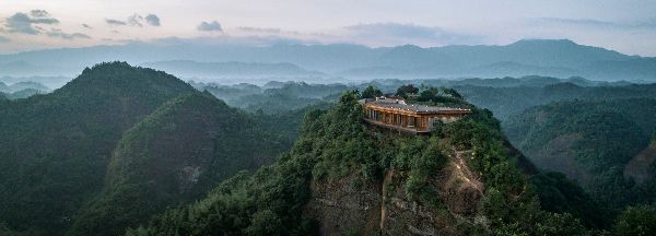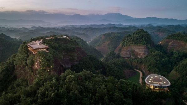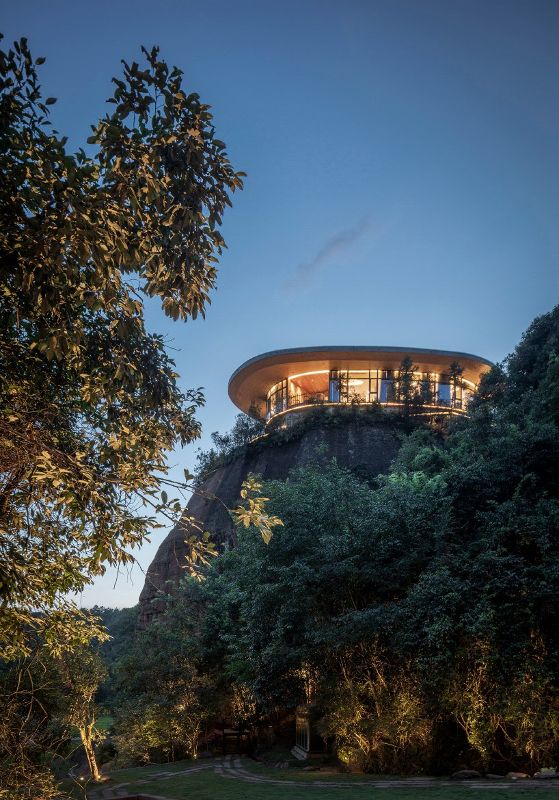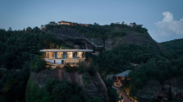 这家位于中国湖南省的酒店坐落在该地区起伏的地形之上,享有河流,山脉和竹林景观的壮丽景色。酒店正式命名为“鹰岩崖居”,由三个独特的建筑组成:位于山顶狭长地带的最大建筑“顶荟”;包含酒店客房的椭圆形建筑“岩上”;核桃形建筑“子崖会”,这里能够举办婚礼、小型演出和其他活动