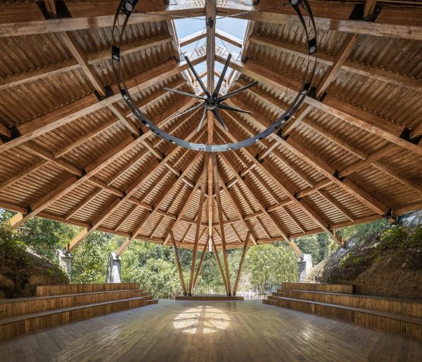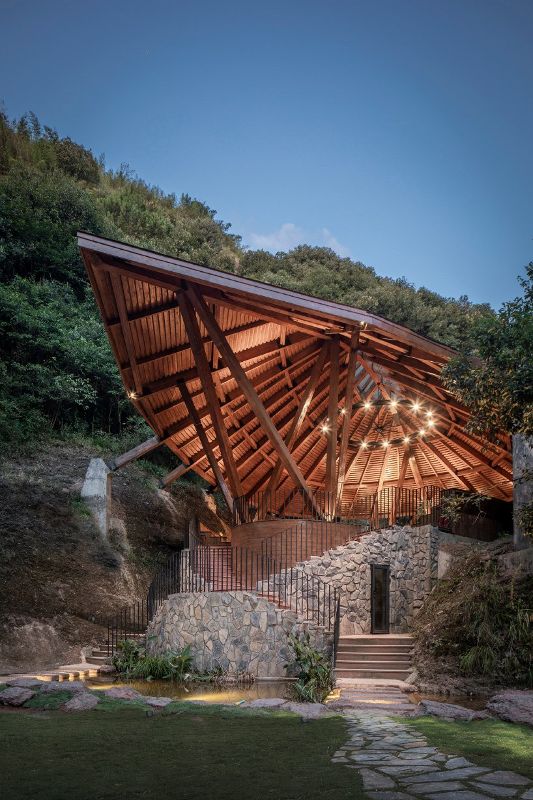 子崖会是该项目的最后一部分,是一个核桃形场地,可用于各种活动,包括婚庆仪式、小型表演、篝火晚会等。该建筑的特点是一个高耸的木质屋顶顶篷,通过天窗提供自然光和通风。在它下面,一个椭圆形的庭院充当了一个舞台。同时,其他辅助空间,如洗手间和储藏设施,都隐藏在地下。