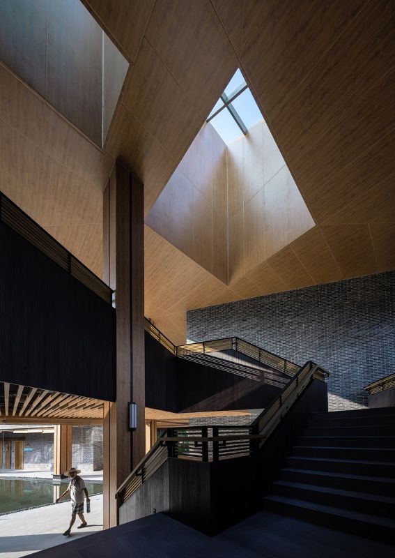 内院的材料采用大量的木质铝板和玻璃,在阳光下展现温暖。内外材料在檐口下过渡,吊顶的木色向外延伸,在水中反射,走廊和庭院周围使用灰砖。天井采用进口印茄木,营造“四水归堂”的安徽民居传统景观。建筑过程成为过去与现代的对话。