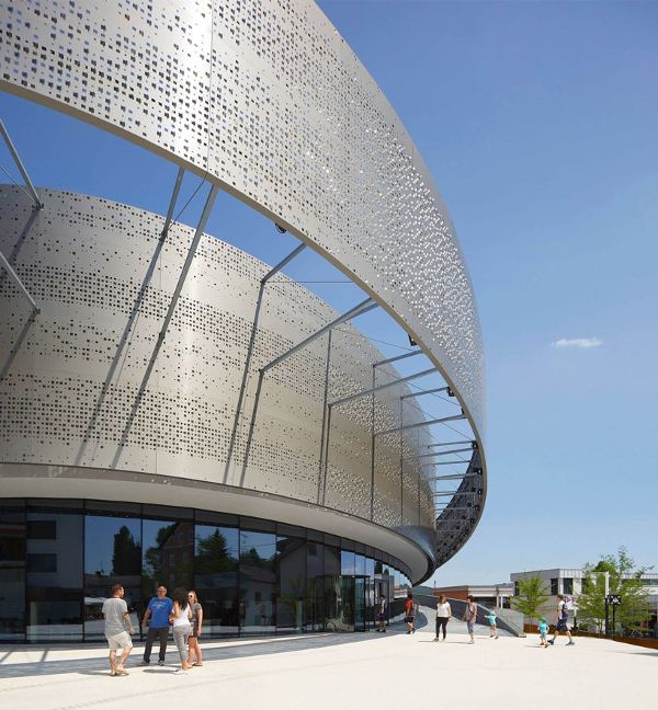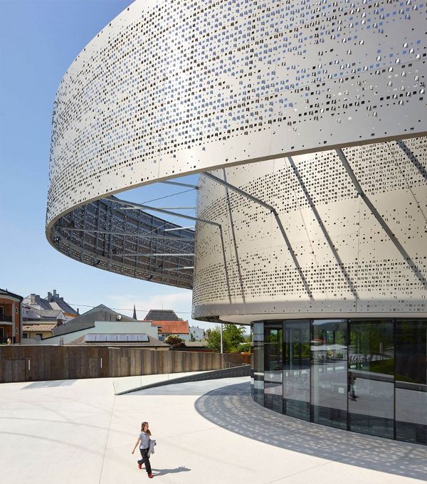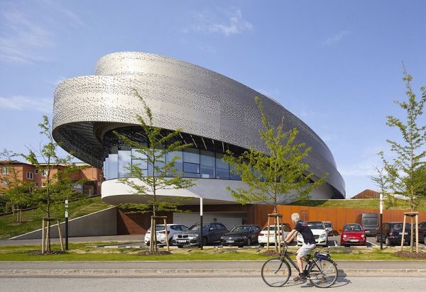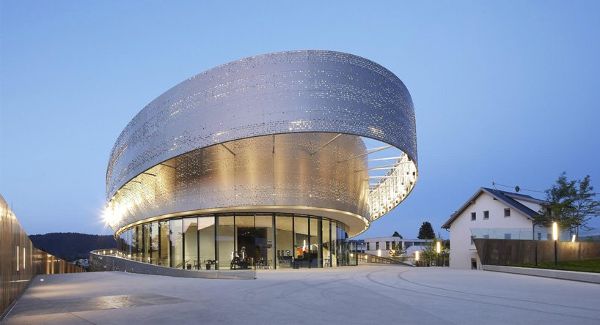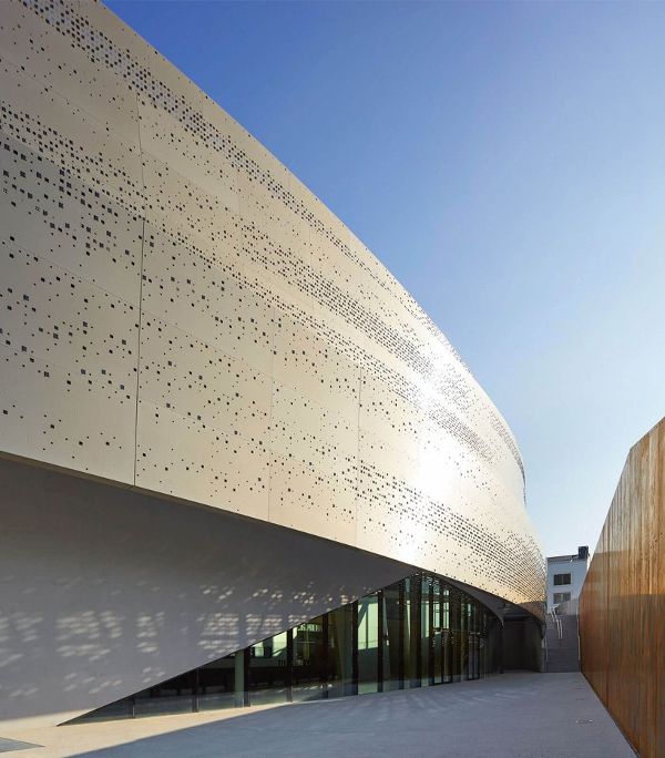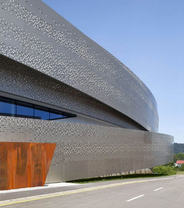 立面的扫掠轨道围绕着建筑弯曲,被多孔的金属带包裹着,在周围的直角建筑中脱颖而出,代表着品牌内外的活力。有机的结构结合了赛道的曲率,越野地形的条件和在其上行驶的KTM自行车,在令人惊叹的建筑特色中总结了品牌的精髓。穿孔的图案象征着轮胎印痕,就像骑手迅速骑过它一样。