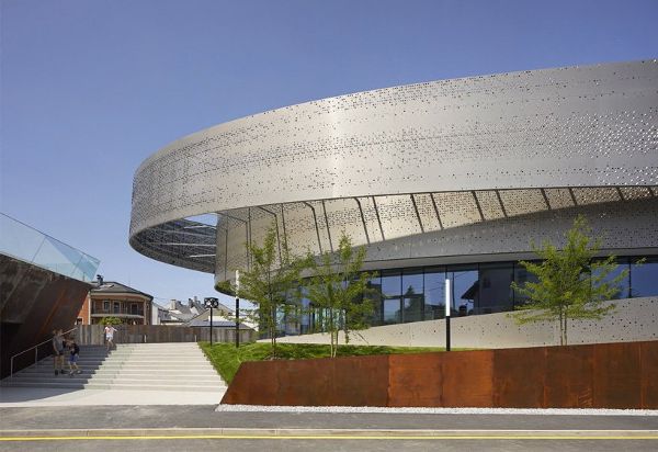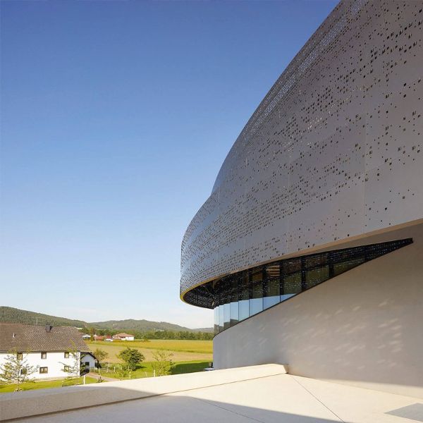 建筑物的承重体系包含九个装在穿孔薄板中的芯子,中间是开阔的空间,可以欣赏到周围的景色,同时也便于自然通风。迈出的每一步都将带来新的视角,曲面的玻璃面向外部景观的不同部分。