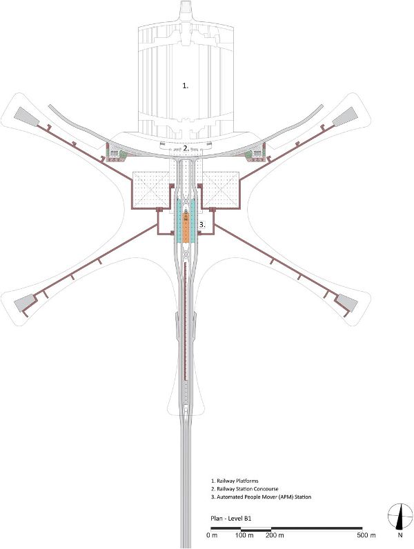 航站楼的建筑呼应了中国传统建筑的原则,即围绕中心庭院组织相互连接的空间。它的设计将引导所有乘客无缝通过相关区域,并朝着中心的一个大院——航站楼中心的一个多层会议空间迈进。航站楼拱形屋顶内的六种流动形式延伸至地面以支撑结构,并将自然光引入室内。这些光线也通过线性天窗网络进入航站楼,为整个建筑提供直观的导航系统。长达100m的结构跨度可为航站楼提供宽敞的公共空间,并为将来的任何改造扩建提供了最高程度的灵活性。