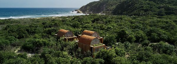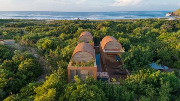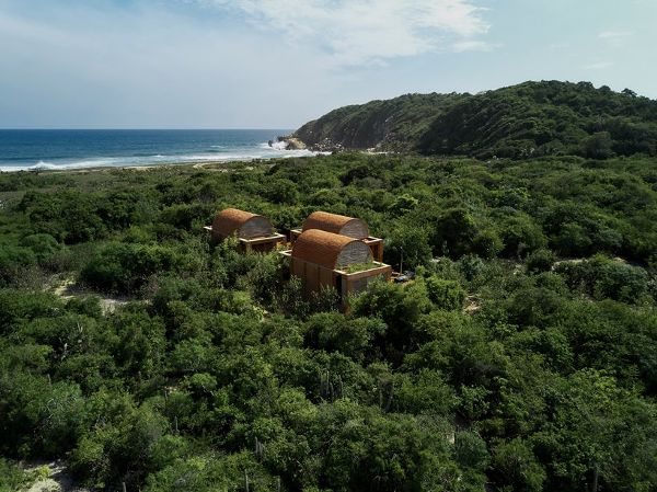 Ambrosi Etchegaray展示了“沃尔特之家”,一个雄心勃勃的住宅项目,该项目包括三个漂浮于瓦哈卡(Oaxacan)海岸茂密植被之间的砖砌的穹顶。设计方根据要求,在最开始就强调项目的体验性。参观者通过一条小径被带入丛林深处,最终通向大片空地。这里有一个长长的池塘,两侧是一排对称的圆柱阵列,倒映在水面上,营造出一种废弃的古典神庙的感觉。