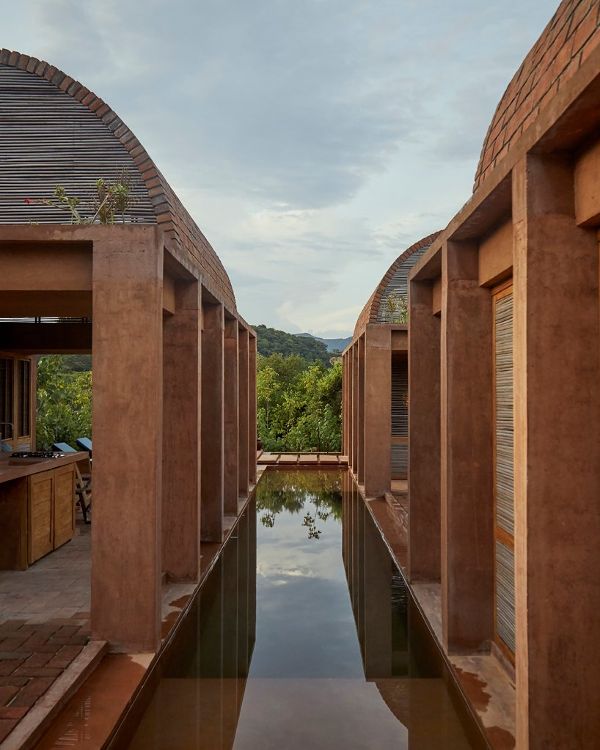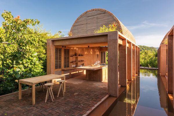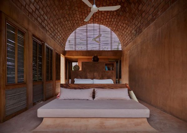 Ambrosi Etchegaray的沃尔特之家的设计和材料在很大程度上受安藤忠雄Casa wabi基金会的影响。这是一处著名的艺术家公社和烧制黏土的场地,它提供了从建筑中遗留下来的未使用的砖块,这些砖块可以回收利用。因此,在用黏土着色的混凝土结构上建造砖拱顶的想法就产生了。水元素使外部庭院格外清新,敞开的拱顶和芦苇格栅使风在整个封闭空间中自由流动。这些元素共同营造了一种温暖和清新的氛围。
